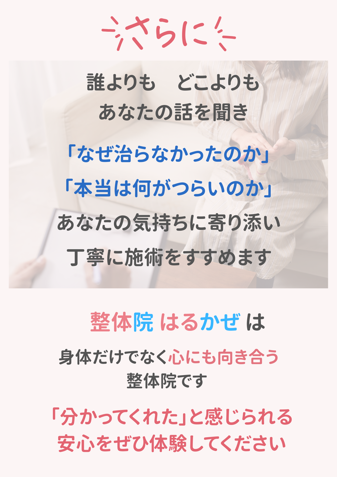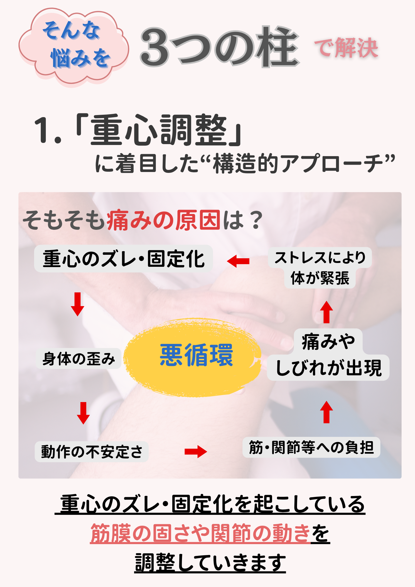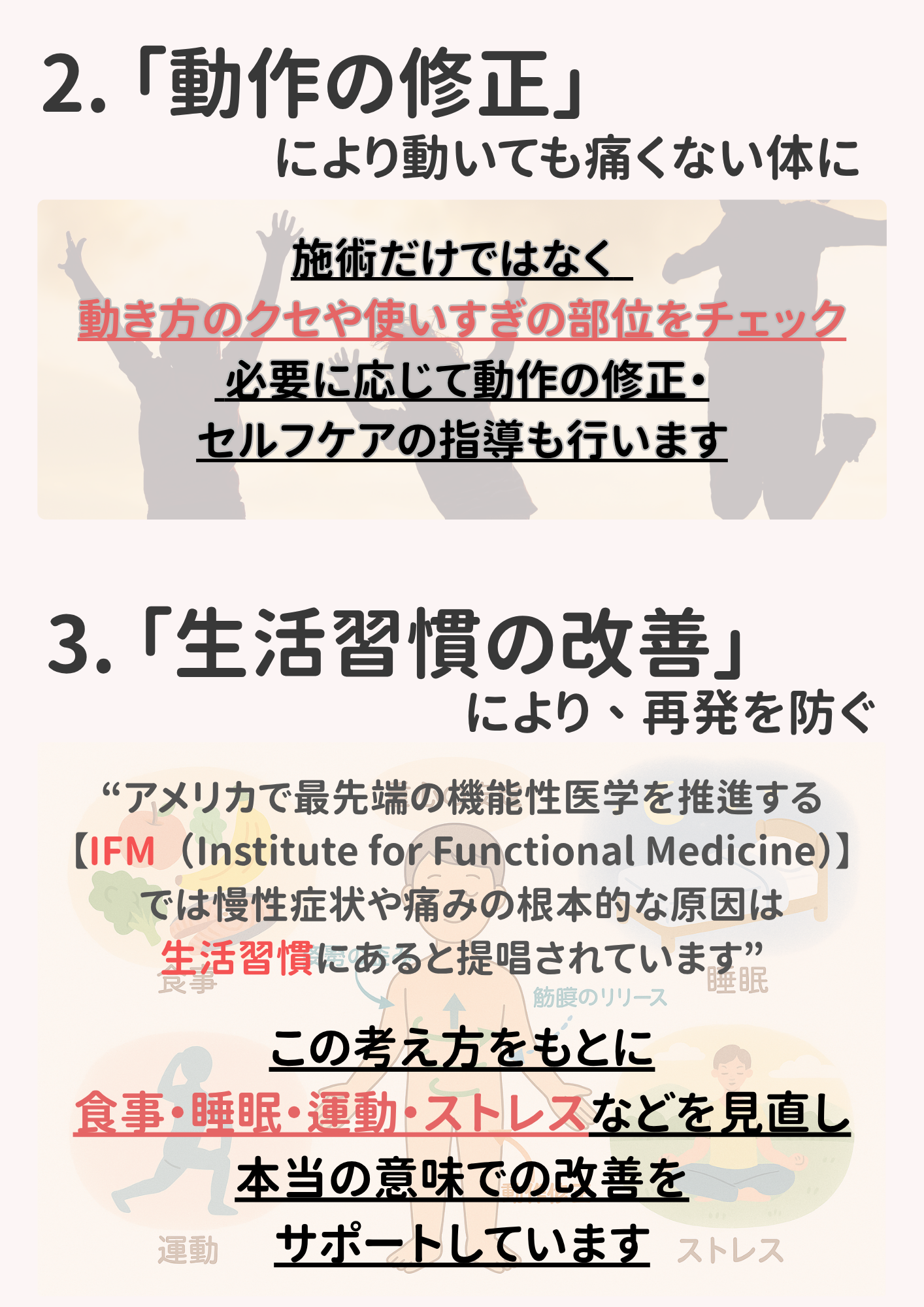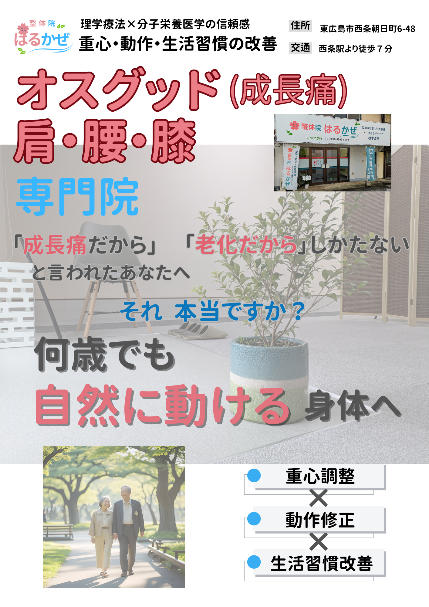 子どもから高齢者まで幅広い年齢層の不調に対応可能です。特にオスグッド・腰痛・膝痛といった スポーツ障害や生活習慣に伴う慢性痛へのアプローチを得意としています。